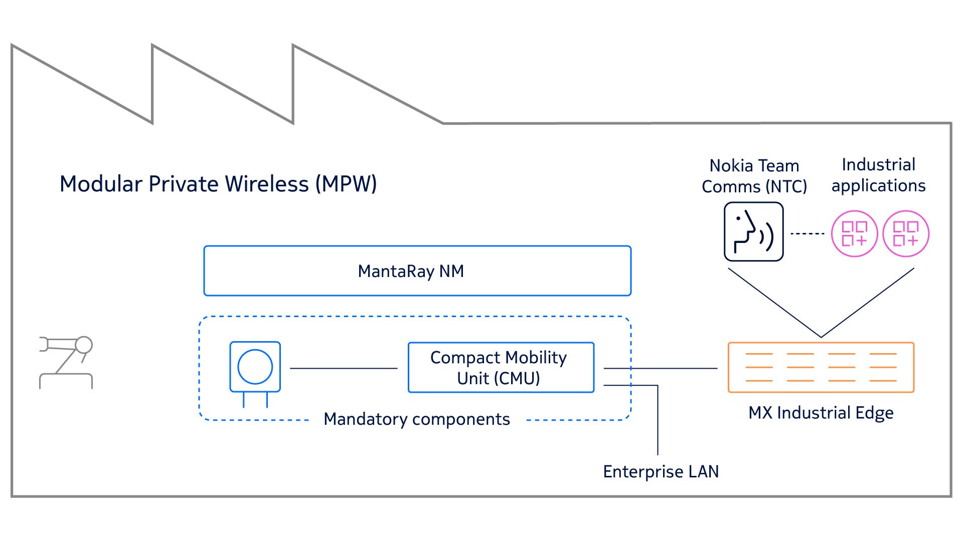 The MPW solution is comprised of mandatory and optional components. Mandatory components include a selection of indoor/outdoor 4.9/LTE & 5G radio portfolio, the Compact Mobility Unit which implements 4G/5G core network and IP transport to interconnect the components. Optional components include network management (MantaRay NM) and MX Industrial Edge (MXIE), both of which you can easily deploy for maximum benefit to digitalize your enterprise.